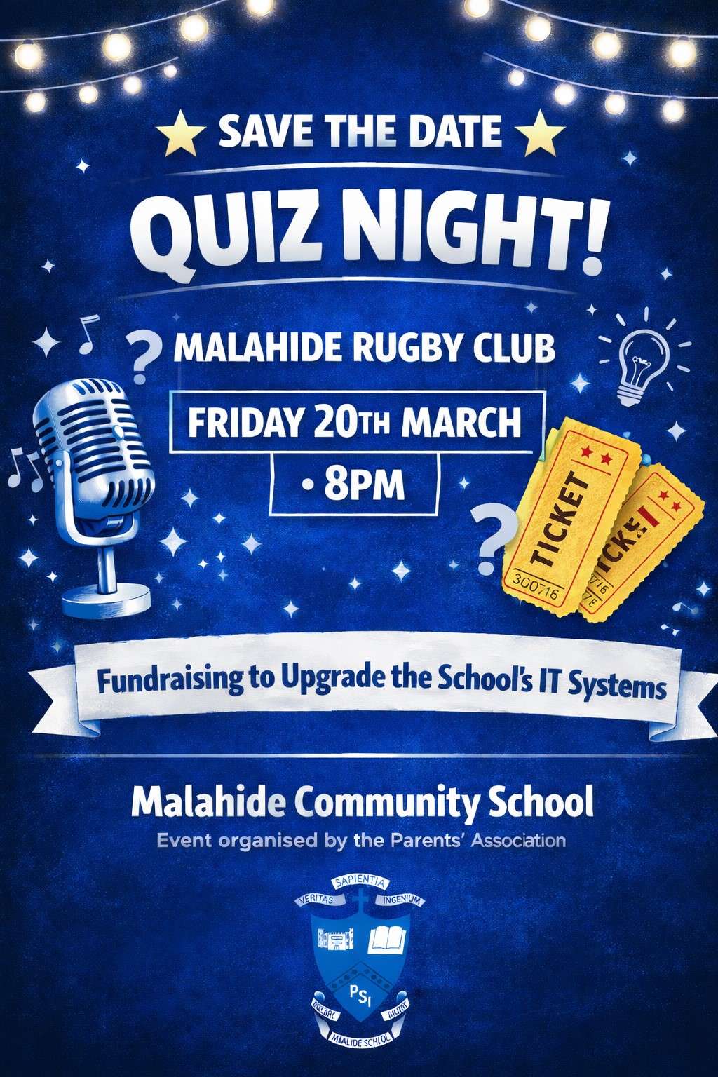 The Parents’ Association (PA) is hosting a quiz fundraiser on Friday March 20th at 8pm in Malahide Rugby Club. We aim to raise funds for a vital upgrade to the school’s ICT systems, which will help to improve learning resources for all students.